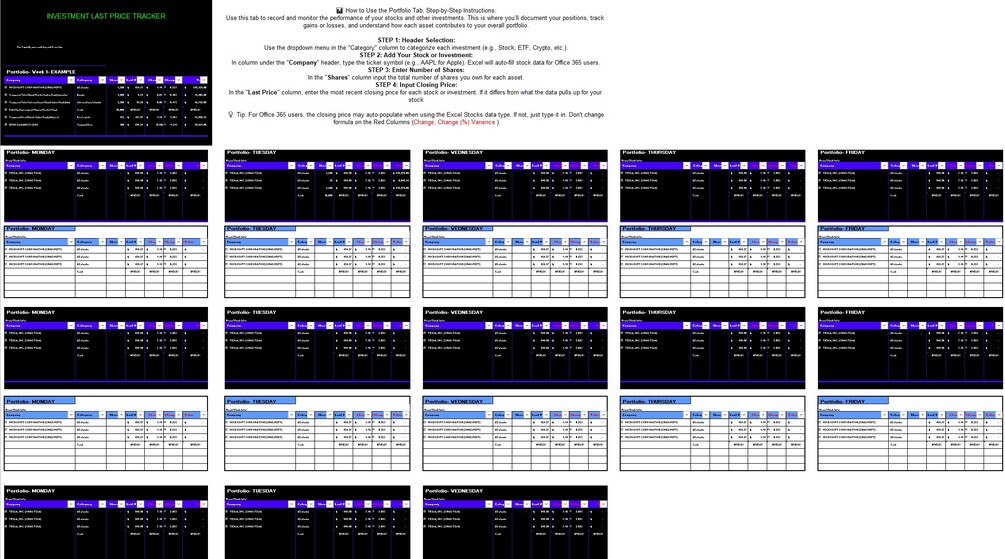 - Ready-to-use spreadsheet with space for each week's portfolio entries